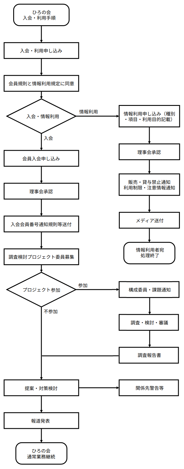 ひろの会は、いわれなき交通事故冤罪に巻き込まれる事件を削減するために、市民自らの知恵と力を養い、警察や司法組織の運用実態を改革する場を設けるために、担い手とご協力者を募集しております。 そのために、警察の捜査資料や裁判資料とそれらに関わる調査・検討資料は、いただいた情報を加工せず、事実として保管し或いは検討素材に提供し、そこから濁りのない真実や対策・改善策を会員に練っていただき、真相・提案として広く市民に提供いたします。調査・検討し、練っていただく、これらの情報には、個人情報や悲惨な現場の情報も原則として加工いたしません。ただし、誰でも参照できるホームページに掲載する情報は個人情報や悲惨な事実を加工することはあります。 会員及び利用者は、この趣旨にご同意いただけた方だけに入口を提供します。 また、検討・論議の正常化を図るため、混乱したときには理事が勧告し、或いは発言の休止等を処置することがあります。この処置の妥当性については会員総会や理事会でチェックいたします。 入会と情報利用の手順については、フローチャートをご覧ください。